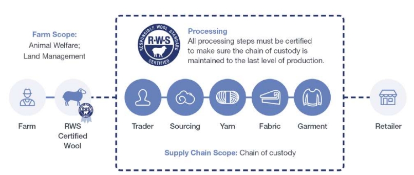 RWS要求所有处理认证羊毛的场所(从农场到最终商业对商业交易的销售环节)均需通过相关模块认证;零售商面向消费者的终端销售环节,无需进行认证。