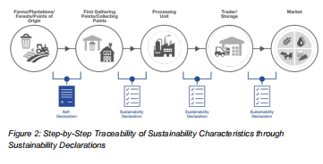 在 ISCC 体系下,物料的来源、加工历史、分销流向及位置的识别与追踪,可通过整个供应链 **“逐环节(step-by-step)”** 实现(见图 2)。沿供应链传递的可持续性声明所载信息,对该追溯方式至关重要。